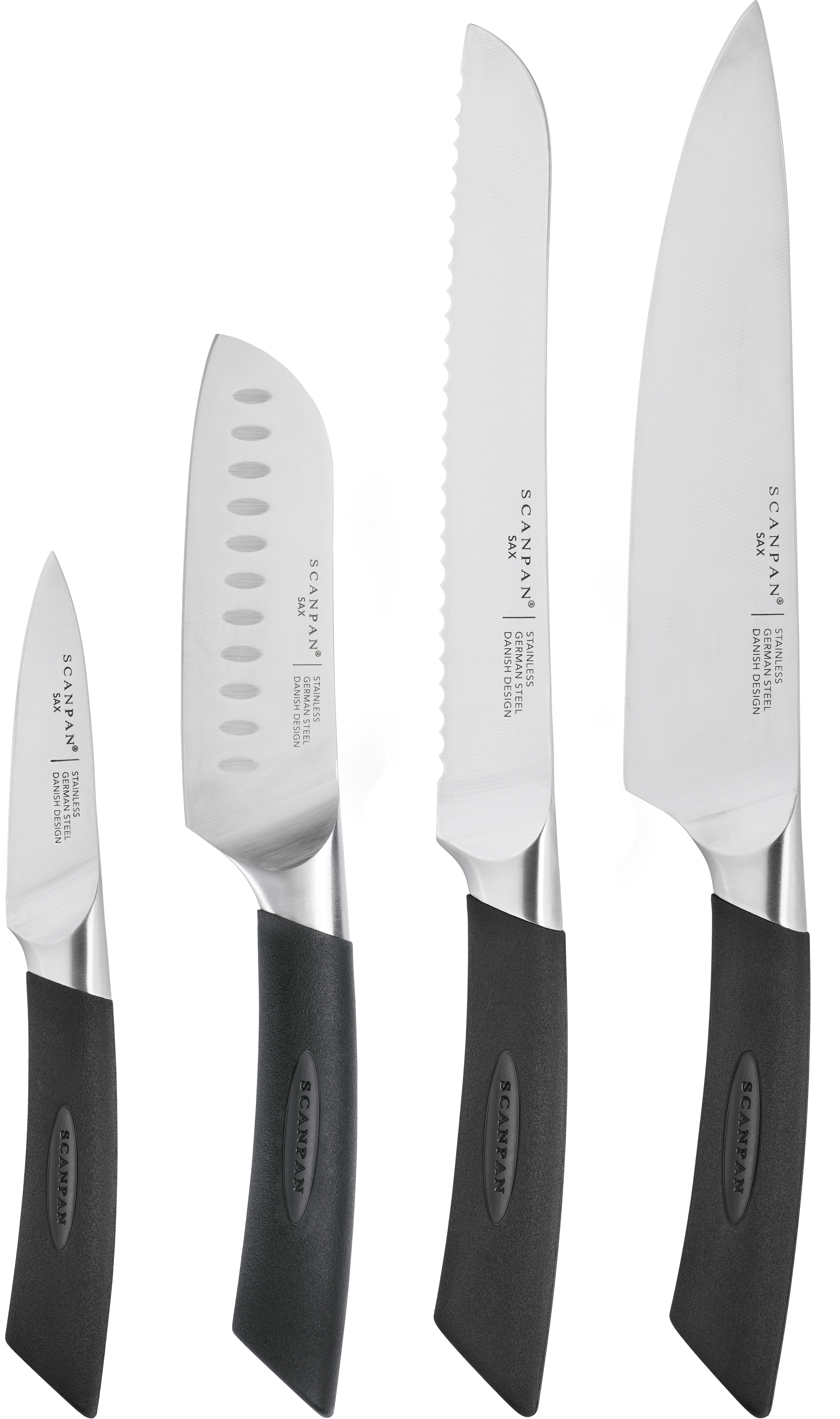 Sættet indeholder: - 9 cm skærekniv - 12,5 cm santoku kniv - 20 cm kokkekniv - 20 cm brødkniv
