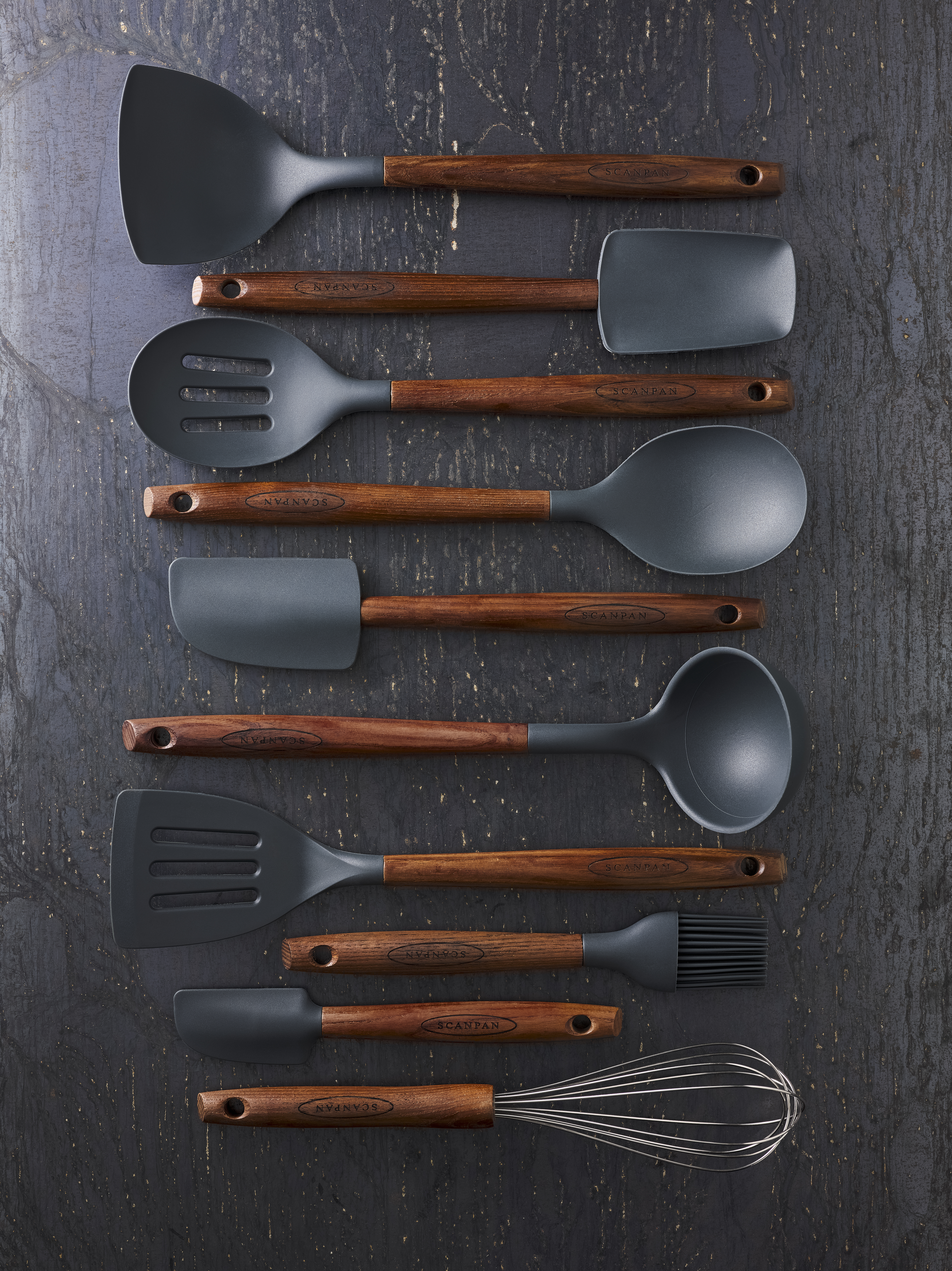 Der Griff ist aus karbonisierter Esche gefertigt und hat einen warmen, goldenen Farbton. Der Kopf besteht aus mattem, dunkelgrauem Silikon, das langlebig ist und bis zu 230 Grad aushält.