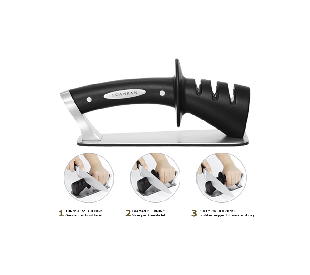 Damit Ihre Messer scharf bleiben und präzise schneiden, müssen sie regelmäßig geschliffen werden. Mit scharfen Messern gehen die Vorbereitungen in der Küche nicht nur leichter von der Hand, scharfe Messer sind auch deutlich sicherer als stumpfe. Beim Schneiden muss weniger Druck ausgeübt werden, die Klinge gleitet besser durch das Schneidgut und rutscht nicht ab. Unser SCANPAN 3-Stufen-Messerschärfer ist das perfekte Werkzeug, mit dem Ihre Messer über lange Jahre scharf und gepflegt bleiben.