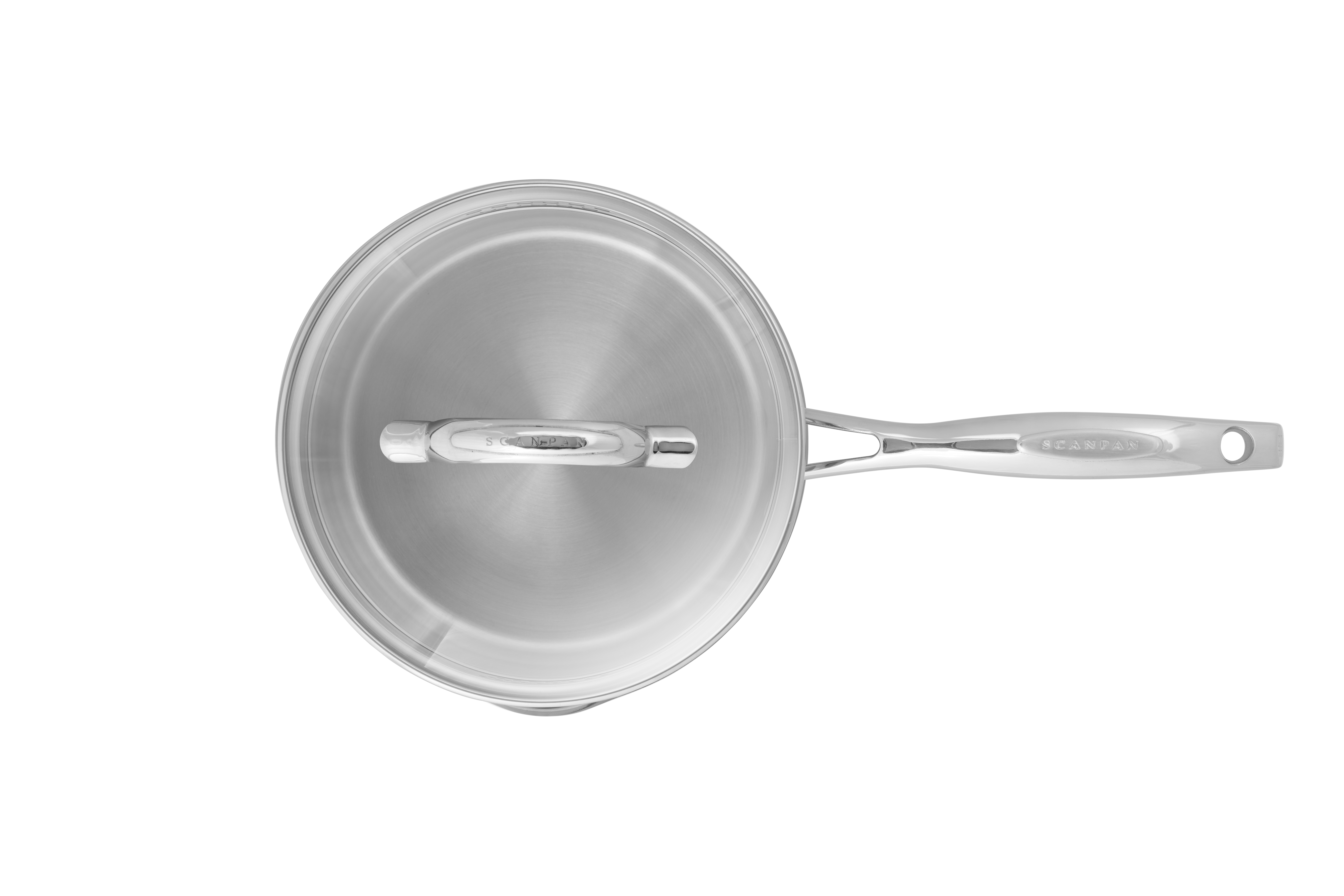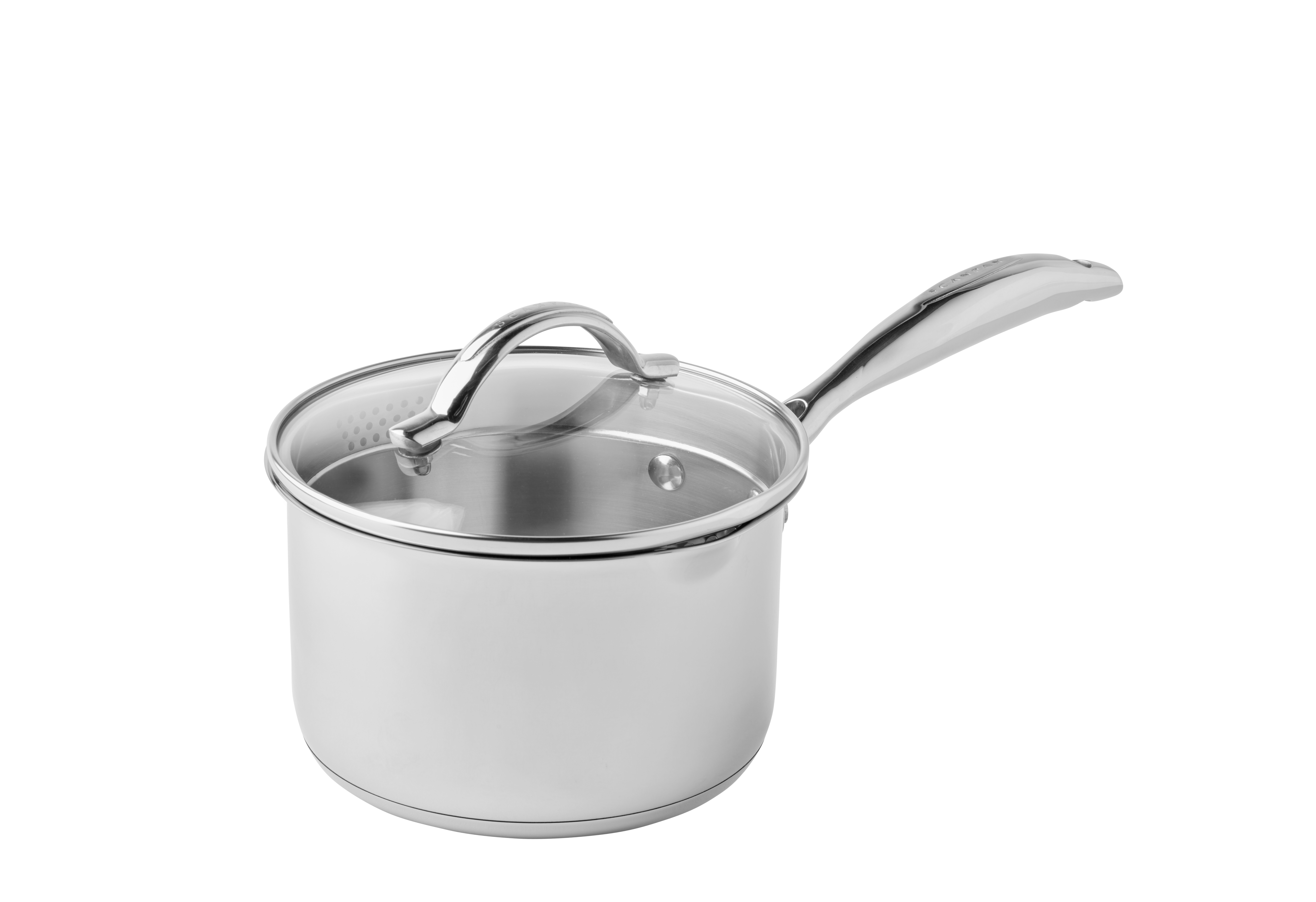 Glanzende roestvrijstalen steelpan met glazen deksel met luchtgaatje. Handgrepen van gegoten roestvrij staal. Mooi design met praktische details zoals een geïntegreerde afgietopening in het deksel, een schenktuit en aan de binnenkant zit een handige meeteenheid. De bodem heeft een ronde vorm en bestaat uit roestvrij staal met een kern van aluminium als warmtegeleider.